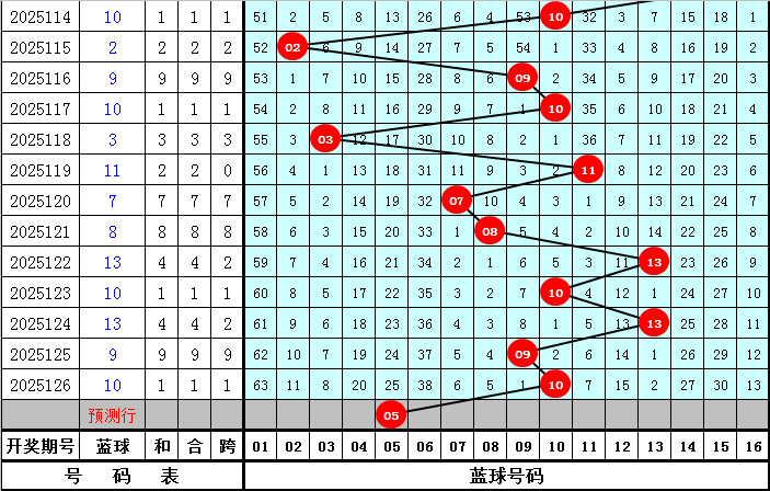 前9期开出7个蓝球号码,蓝球以冷码为主,热码蓝球开出相对较少,还没有出现的蓝球为:01、02、04、05、06、12、14、15、16,共9个,本期防蓝球为冷码,遗漏值较大,参考蓝球号码05。