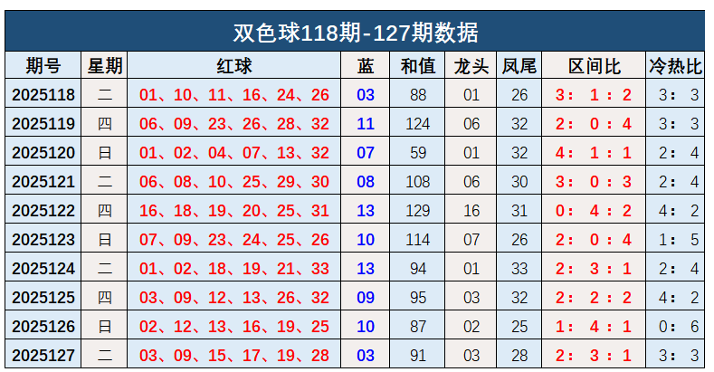 双色球第2025127开奖奖号:红球03、09、15、17、19、28,蓝球03。和值91,龙头03,凤尾28,区间比2:3:1,冷热比3:3。蓝球开出小数号码03。