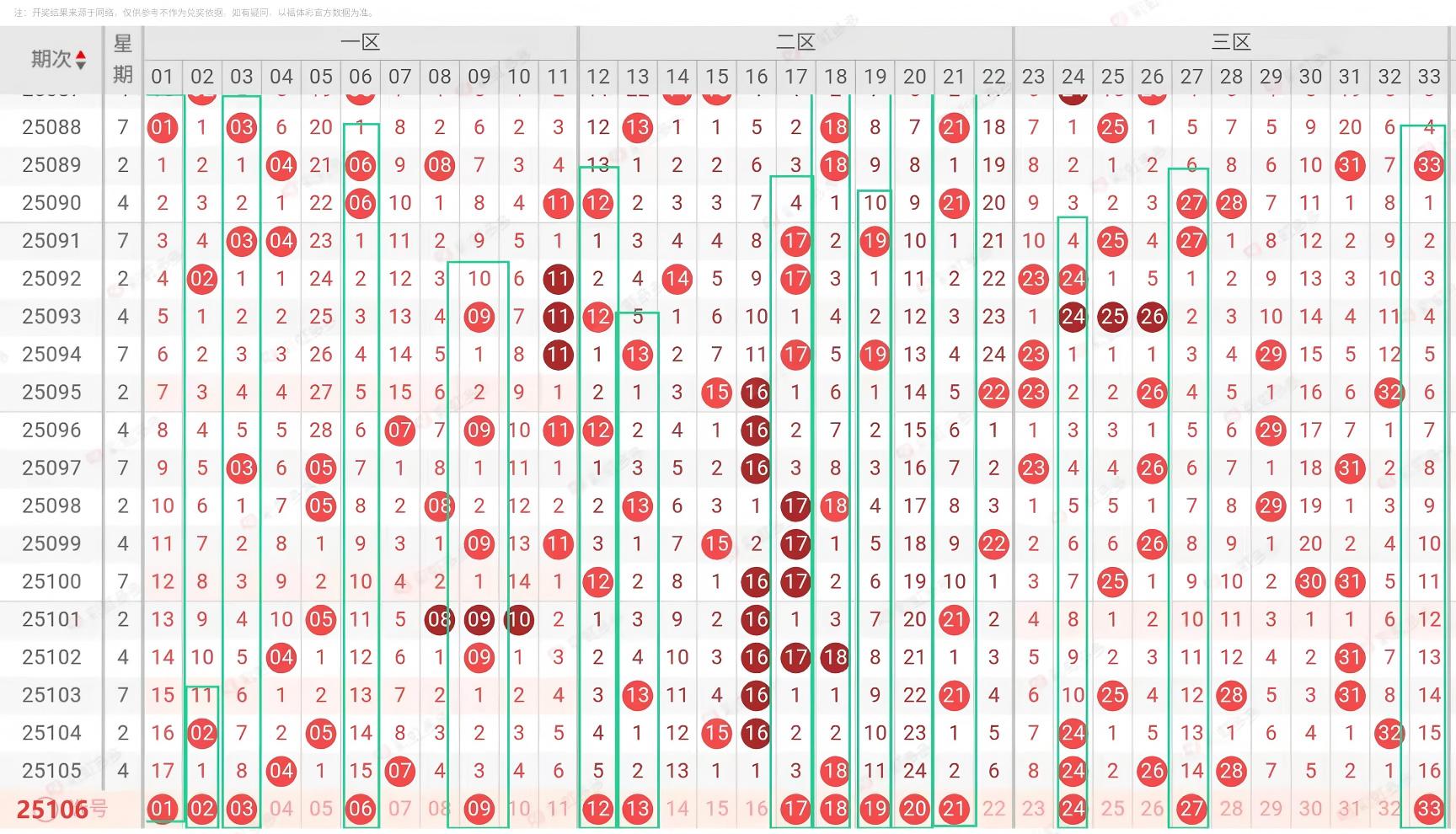 第六位28、奇偶比是5:0,质合比是1:4,奇质数重合数有1个奇数、1个质数按出现顺序排列分别是29。奇合数重合数有2个偶数、2个合数按出现顺序排列是33、33。奇合数重合偶数有2个,合数2个合数按出现顺序排列分别是21、27。在百期内28在第六位出现的次数中在码落后出现的第六位数的跨度在21到33之间也在三区间以内落号几率比较高,回看十期内第六位开奖号码出现在二区三区比为1:9,按照奇偶排列走势和质合排列走势综合看好奇合数,所以第六位开奖号码可参考27、33。