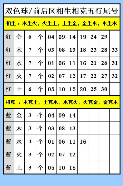 双色球,红蓝区相生相克五行尾号。