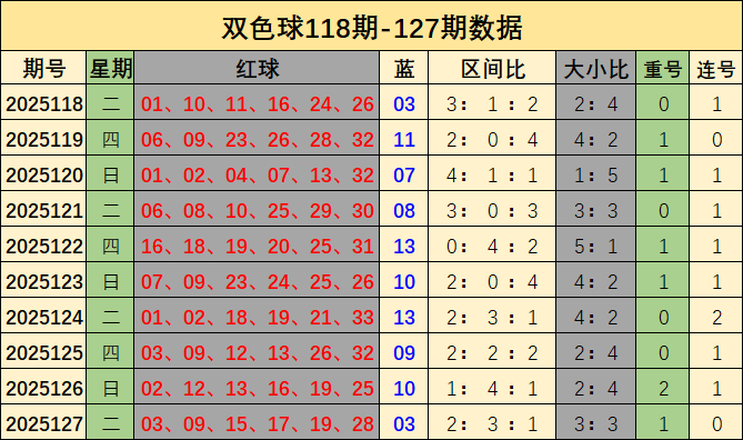 上期回顾,开出奖号:红球03、09、15、17、19、28,蓝球03。红球号码大小比为3:3,三区比为2:3:1,奇偶比为5:1。本期红球开出重号19,未开出连号.