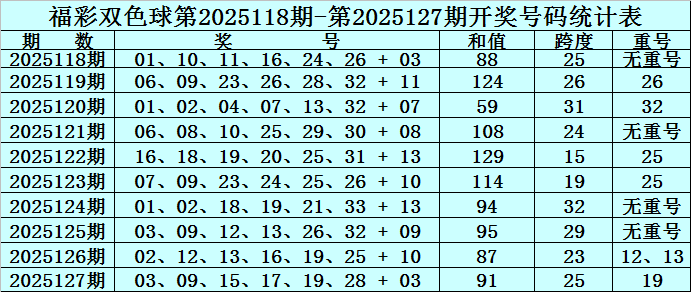 双色球第2025127期奖号开出:03、09、15、17、19、28 + 03,红球号码和值开出91,跨度开出25,开出重号1个:19。蓝球为0路号码。