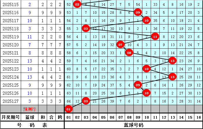蓝球分析:上期开出蓝球号码03,号码遗漏值为2,温冷蓝球近期开出比例较高,本期防冷码蓝球继续解冻,参考蓝球号码01。