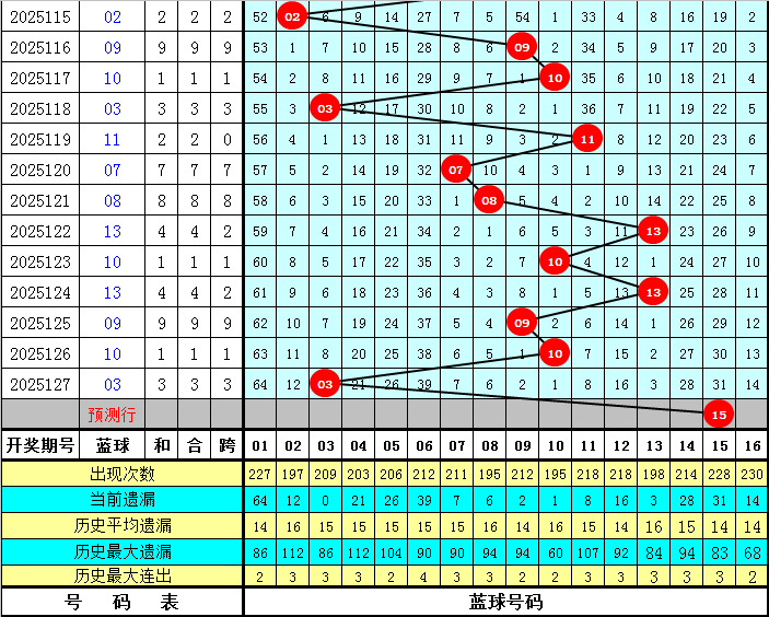 蓝球:最近7期蓝球号码分别开出08、13、10、13、09、10、03,质合蓝球走势相当,上期开出质数号码,本期注意合数蓝球回补,关注号码15。