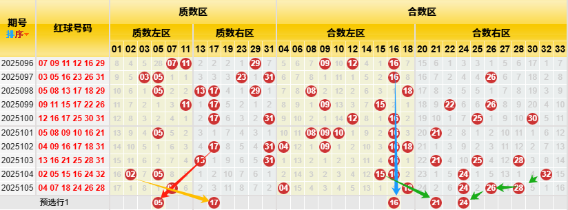 【数据参数】 根据前区质合小大属性,组合成上图质数区1、2、3、5、7、11、13、17、19、23、29、31和合数区4、6、8、9、10、12、14、15、16、18、20、21、22、24、25、26、27、28、30、32、33,质数区分为质数左区1、2、3、5、7、11和质数右区13、17、19、23、29、31;合数区分为合数左区4、6、8、9、10、12、14、15、16、18)和合数右区20、21、22、24、25、26、27、28、30、32、33。