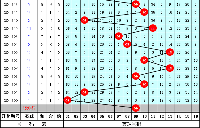 蓝球分析:去年第129期蓝球奖号为01,开出1路蓝球,目前0路蓝球轮空13年,今年同期适当关注0路蓝球回补,看好号码09。