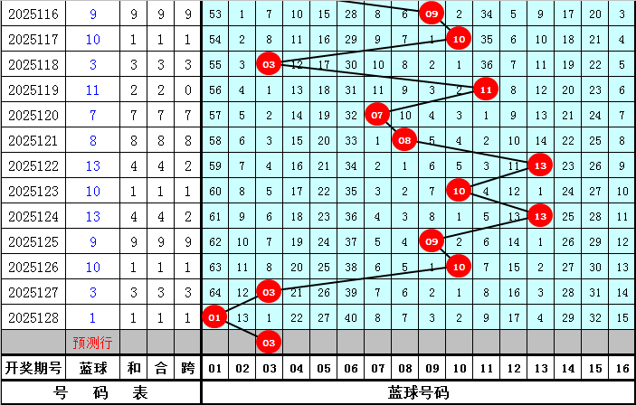 蓝球推荐:蓝球上期开出奖号01,为奇数蓝球,本期预计蓝球继续开出奇数号码,蓝球参考01、03、05、13、15。