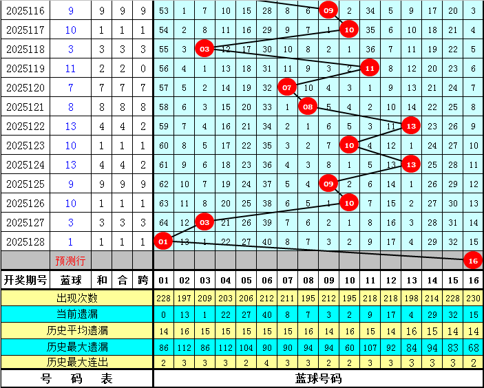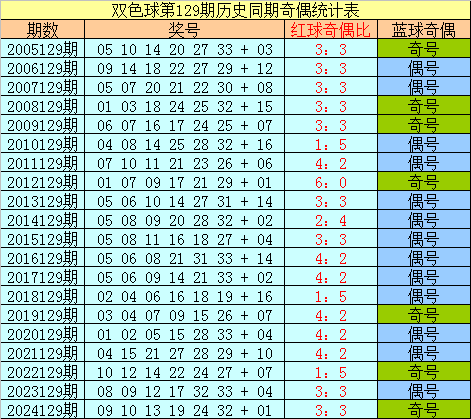 蓝球分析:在第129期历史同期开奖中,蓝球号码奇偶比为7:13,最近5年同期奇偶走势为:偶、偶、奇、偶、奇,今年同期注意偶数蓝球回补,关注号码16。