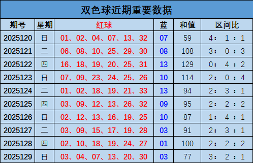双色球上期开出奖号:03 04 07 13 20 30+03,和值77,区间比3:2:1