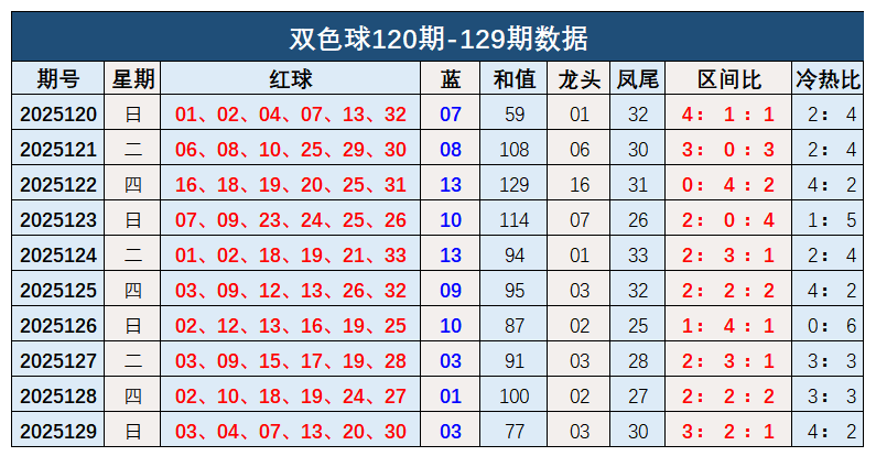 双色球第2025129开奖奖号:红球03、04、07、13、20、30,蓝球03。和值77,龙头03,凤尾30,区间比3:2:1,冷热比4:2。蓝球开出小数号码03。