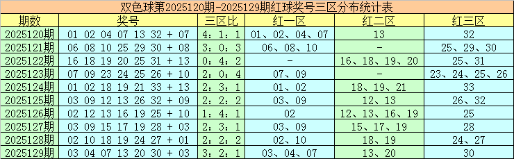 双色球第2025129期开出奖号为:03、04、07、13、20、30+03,其中红球三区比为3:2:1,蓝球开出奇数、小 号、0路号码。
