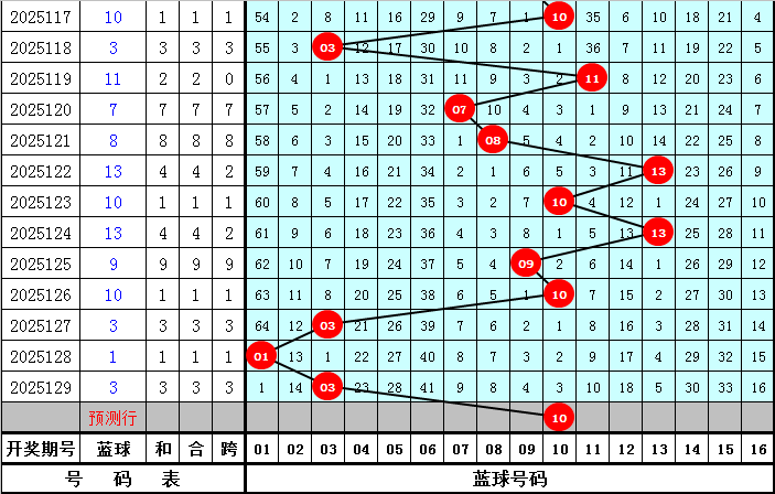 前9期开出6个蓝球号码,热码蓝球出现频次较高,没有开出的蓝球为:02、04、05、06、07、11、12、14、15、16,共10个,本期注意热码蓝球出现,一码蓝球参考10。