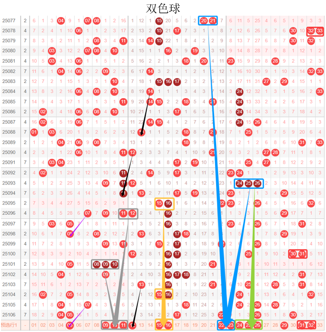 重点关注码(近30期内距离本期在1~4期的号码):9、15、16、24、25、31、32