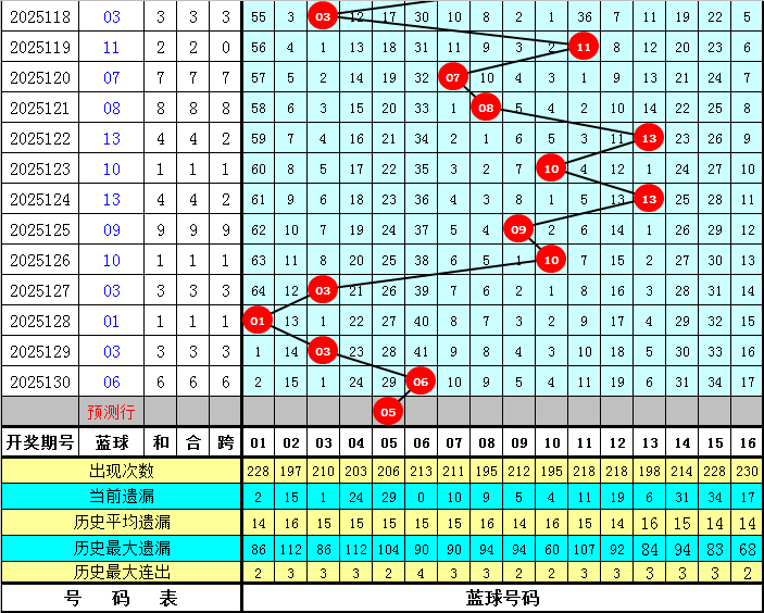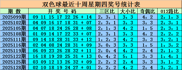 蓝球走势分析:上周四第25128期蓝球开出号码01,最近十周星期四蓝球号码大小比为6:4,奇偶比为7:3,012路比为3:4:3。本期蓝球建议侧重奇数号码,参考蓝球05、15。