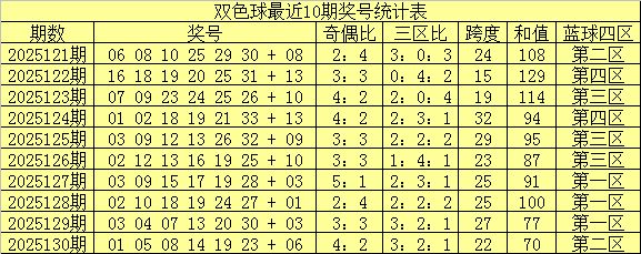 南华天第2025131期双色球区间号码个数统计分析:(红球:01-11为一区,12-22为二区,23-33为三区;蓝球:01-04为一区,05-08为二区,09-12为三区,13-16为四区)