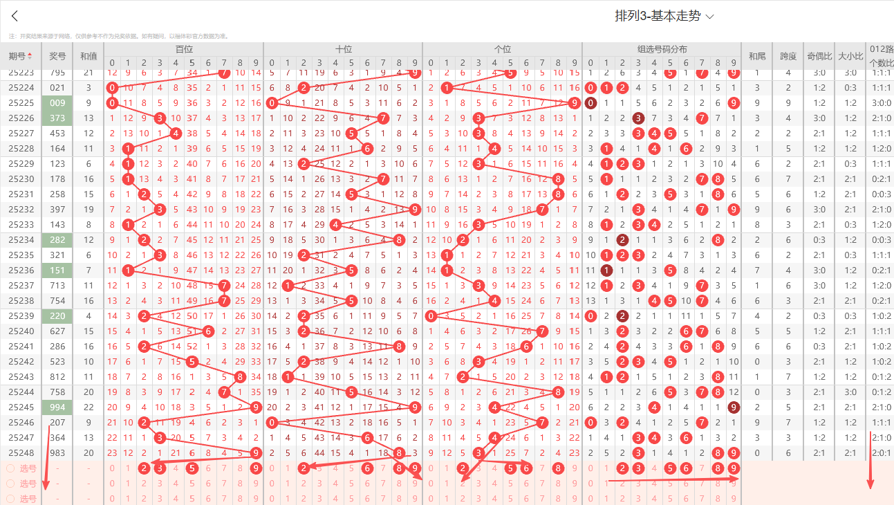 ①百位:上期开出大号奇数5号,在历史开奖记录中显示一般正常的奇偶周期平均在1~3期为普遍现象,上期出现奇偶互变为奇数2路号码,依据奇偶以及012路周期性规律的转变特征点即本期2路号码有开出的趋势0路号码注意预防。