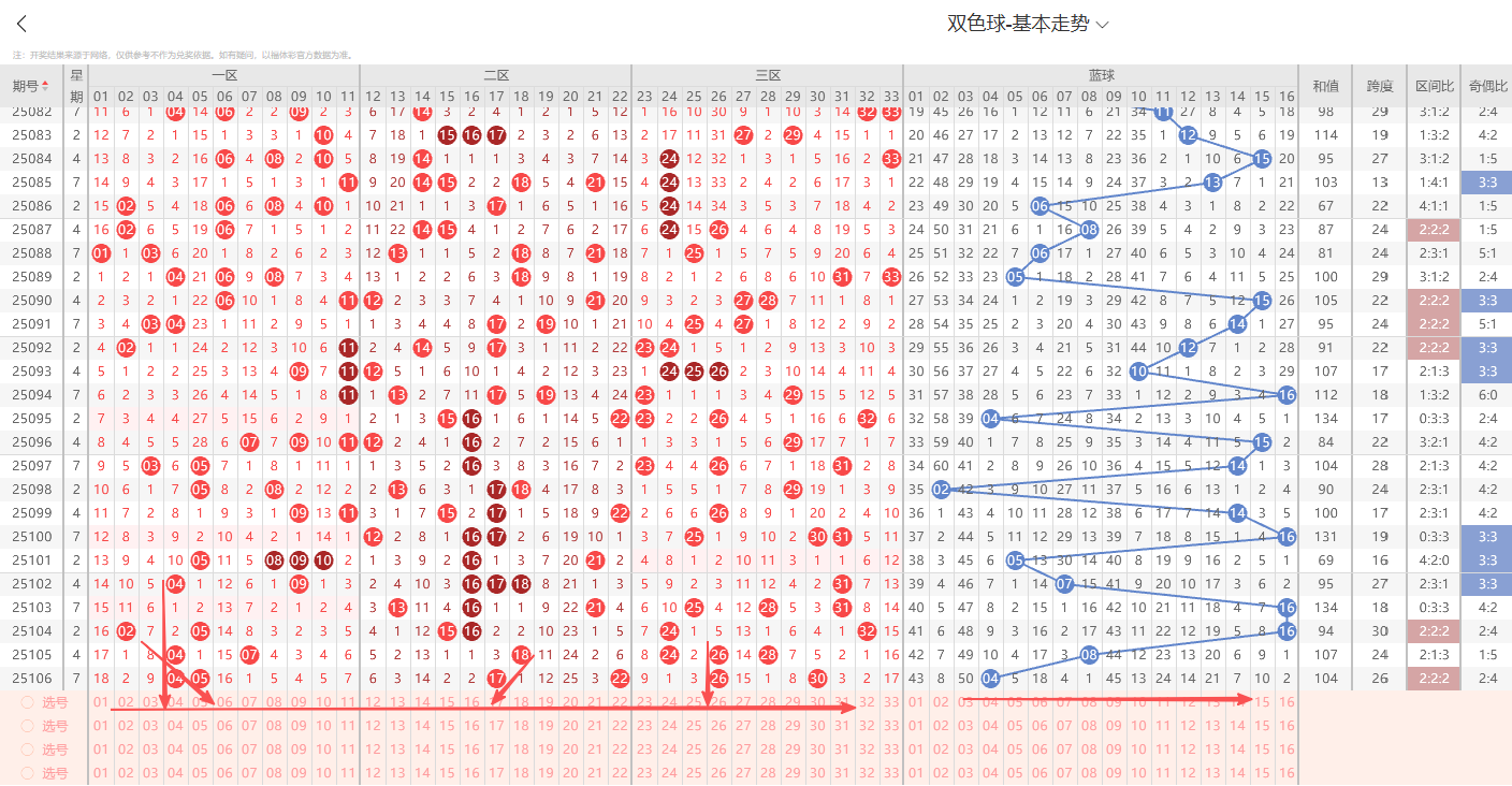 1、红球特征分析:(通过整体走势不难看出每期开奖号都具备以下明显的特征点)