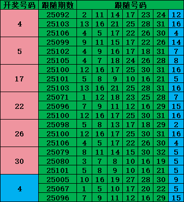 把上期开出的红蓝球近三期的跟随号统计后,跟随大于2次的号就可以重点关注: