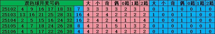 双色球红球每期是从01-33的号码里每期开出6个红球,01-16号是小号,17-33号是大号,尾数13579是奇数号,02468是偶数号。蓝球每期是从01-16号里开出1个蓝球,01-08是小号,09-16是大号,尾数13579是奇数号,尾数02468是偶数号。