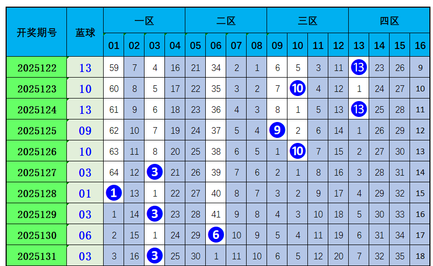 最近10期蓝球号码分别开出13、10、13、09、10、03、01、03、06、03,大小比为5:5,本期预测开出大数蓝球号码:13。