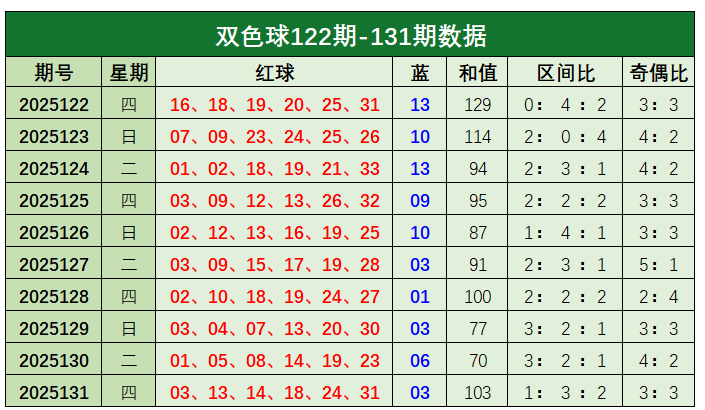 双色球第2025130开奖奖号:红球03、13、14、18、24、31,蓝球03。红球和值为103,区间比为1:3:2,奇偶比为3:3。蓝球开出03。