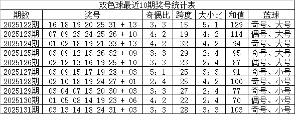 双色球第2025131期奖号为:03、13、14、18、24、31+03。其中红球和值为103,奇偶比为3:3,大小比为3:3,蓝球开出奇数、小 号。