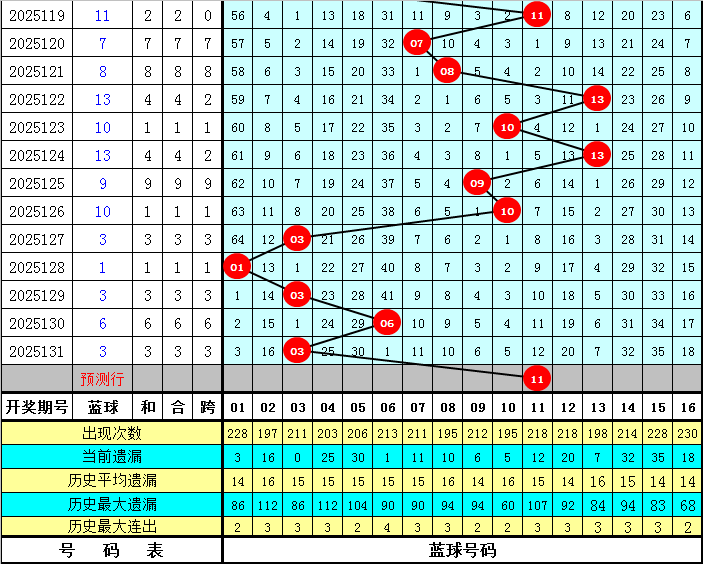 蓝球分析:在第132期历史同期开奖中,蓝球号码奇偶比为12:8,最近5年同期奇偶走势为:偶、偶、偶、奇、奇,今年同期预计再出奇数号码,参考蓝球11。