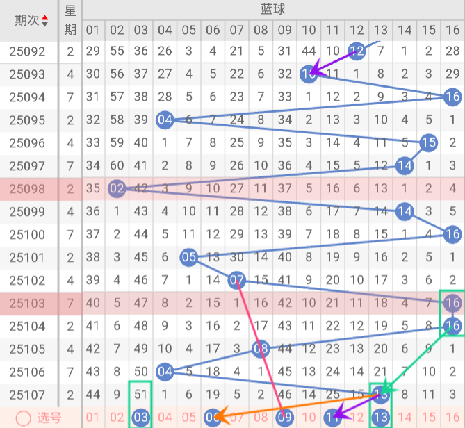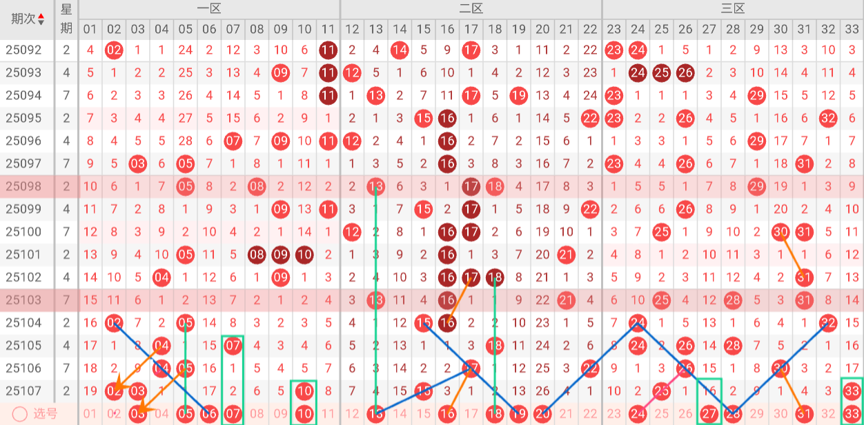 根据以上特点,我们对双色球第25108期进行如下分析: