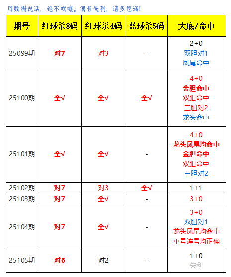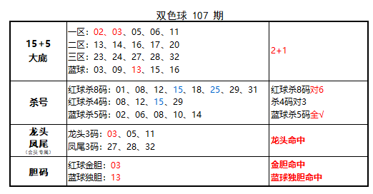 上期红球杀8码对6,免费文章杀4码对3,蓝球杀5码全对,金胆命中,蓝球独胆命中,龙头命中,大底命中2+1,本期再接再厉!