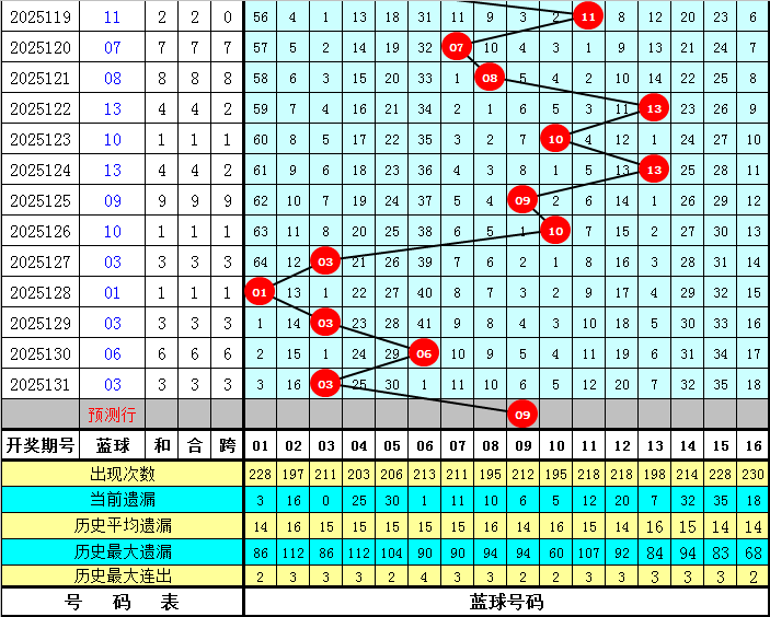 上期开出蓝球号码03,该号码在最近300期中出现了24次,其下期分别开出:蓝球01出现3次,蓝球04、06、08、10、11、12、14、15出现2次,蓝球02、03、05、07、13出现1次,蓝球09、16出现0次。本期五码蓝球参考02、04、08、09、12,独蓝关注09。
