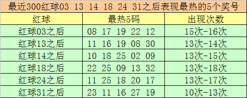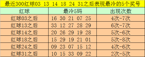 红球冷码统计:双色球第2025131期开出红球奖号分别为:03、13、14、18、24、31,在最近300期开奖中,各号码出现之后其下期出现最少的5个红球分别为: