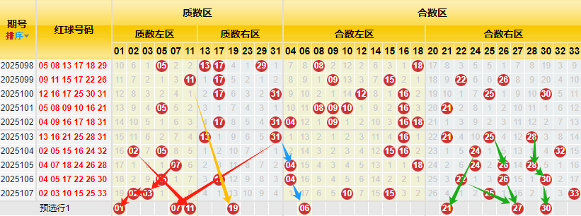 【数据参数】 根据前区质合小大属性,组合成上图质数区1、2、3、5、7、11、13、17、19、23、29、31和合数区4、6、8、9、10、12、14、15、16、18、20、21、22、24、25、26、27、28、30、32、33,质数区分为质数左区1、2、3、5、7、11和质数右区13、17、19、23、29、31;合数区分为合数左区4、6、8、9、10、12、14、15、16、18)和合数右区20、21、22、24、25、26、27、28、30、32、33。