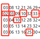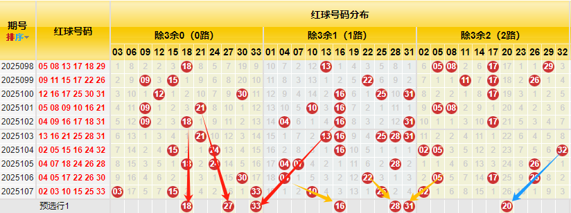 【数据参数】 根据前区除3余数,组合成上图分别为余0路(简称0路)3、6、9、12、15、18、21、24、27、30、33;余1路(简称1路)1、4、7、10、13、16、19、22、25、28、31; 余2路(简称2路)2、5、8、11、14、17、20、23、26、29、32。