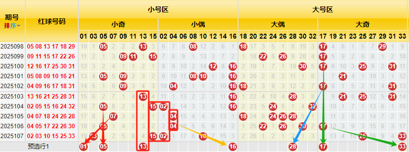 1、小大奇偶交叉图(小奇数红色箭标、小偶数黄色箭标、大偶数蓝色箭标、大奇数绿色箭标)