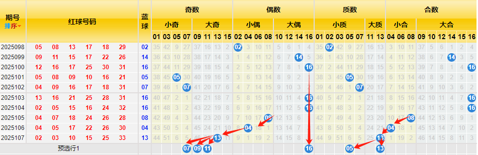 根据蓝球近十期数据统计:小奇数出现2次,大奇数出现1次,小偶数出现3次,大偶数出现4次,小质数出现3次,大质数出现1次,小合数出现2次,大合数出现4次。从上述数据可以看出看出小质数、大合数处于极热状态正在转冷,本期关注大质数和合数回补;再来看历史数据统计,小奇数出现848次,大奇数出现851次,小偶数出现803次,大偶数出现750次,小质数出现816次,大质数出现413次,小合数出现608次,大合数出现888次,从上述数据可以看出小奇数、大偶数、小质数、小合数历史数据占优,结合近十期数据对比,因此短期内关注合数和奇数持续大热,故本期结合上述数据并根据斜率对称原理看好07 09 11 16 05 13