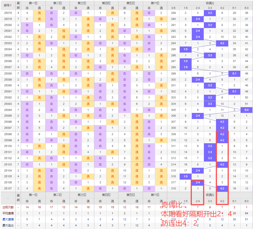 上期奇偶比:4:2,近10期奇偶比出现情况:4:2、4:2、3:3、3:3、3:3、4:2、2:4、1:5、2:4、4:2,最近10期出现3期3:3,出现4期4:2,出现2期2:4,出现0期5:1,出现1期1:5,出现0期6:0,出现0期0:6,根据近10期规律本期看好隔期开出2:4,防连出4:2,综上所述推荐奇偶比推荐:4:2,重点关注:2:4。