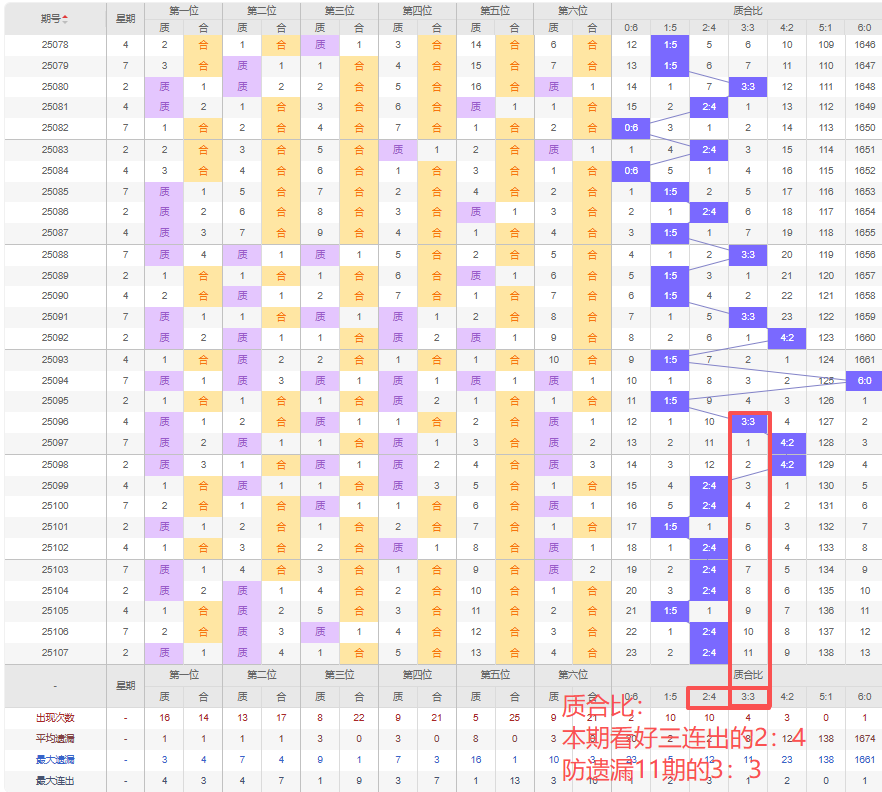 上期质合比:2:4,近10期质合比出现情况:4:2、2:4、2:4、1:5、2:4、2:4、2:4、1:5、2:4、2:4,最近10期出0期3:3,出现1期4:2,出现7期2:4,出现0期5:1,出现2期1:5,出现0期6:0,出现0期0:6,根据近10期规律本期看好三连出2:4,防遗漏11期的3:3,综上所述推荐质合比推荐:3:3,重点关注:2:4。