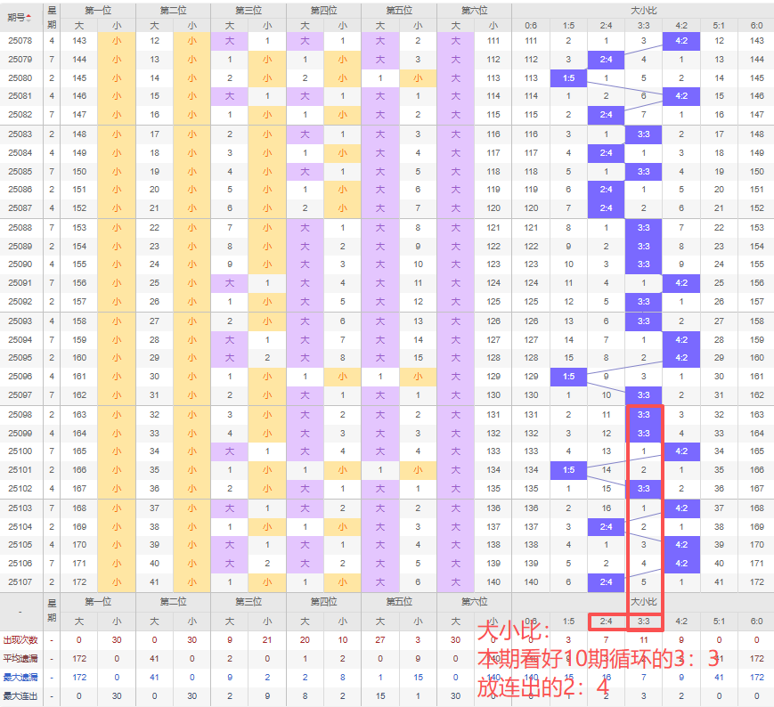 上期大小比:2:4,近10期大小比出现情况:3:3、3:3、4:2、1:5、3:3、4:2、2:4、4:2、4:2、2:4,最近10期出现3期3:3,出现4期4:2,出2期2:4,出现0期5:1,出现1期1:5,出现0期6:0,出现0期0:6,根据近10期规律本期看好10期循环的3:3,防连出的2:4,综上所述推荐大小比推荐:2:4,重点关注:3:3。