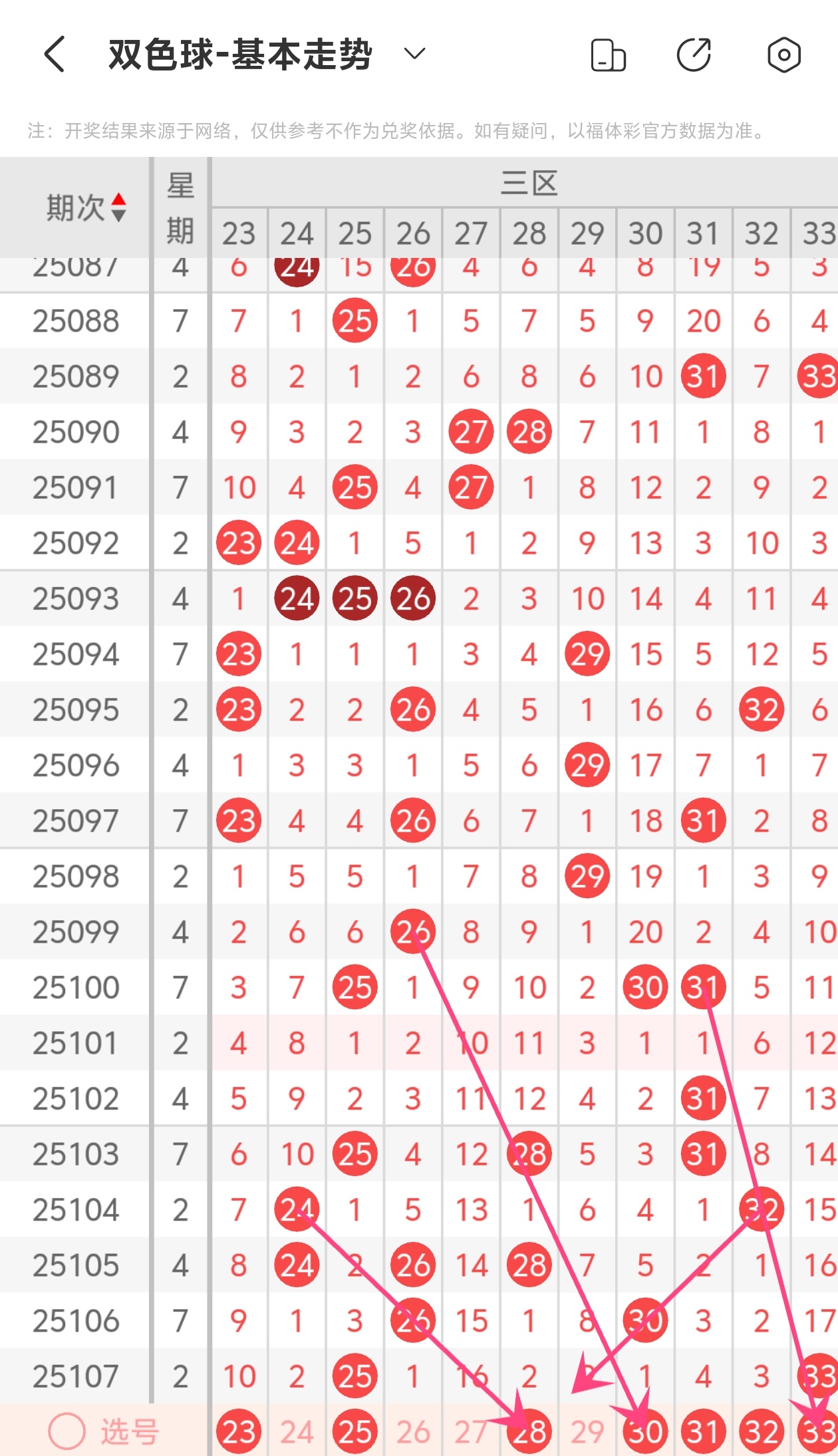 下面双色球的第三区间走势图分析: