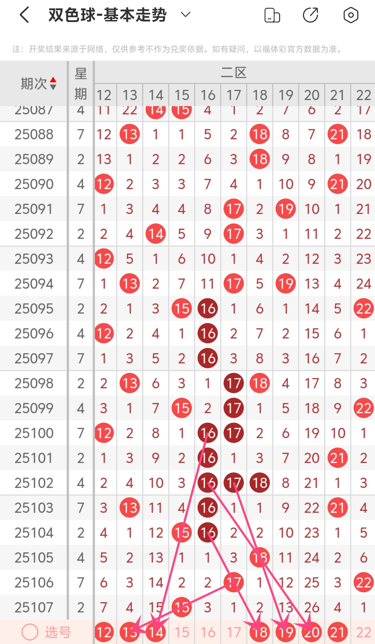 上期第二区间开出15,本期我们可以从上面走势图中看到选号的思路,13为斜连走势,14为斜连走势,18为斜连走势,19为斜连走势,20为斜连走势,本区间你要是看好前区就放弃后区的号码,综合以上分析本期第二区间推荐12 13 14 18 19 20 21