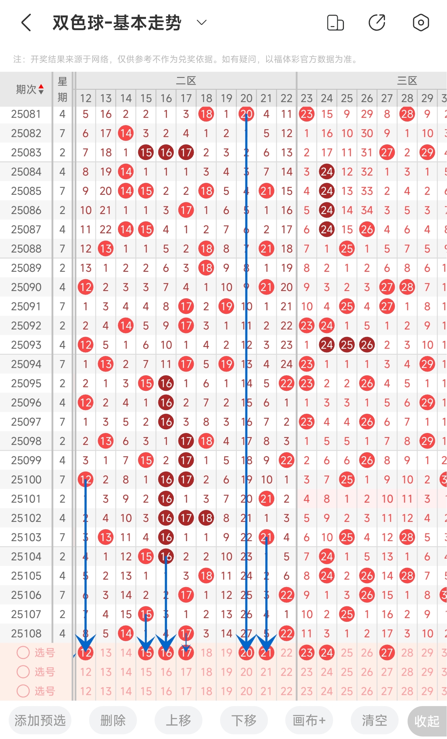 上一期二区开出了14,17,22等号码。往前一期开出了15。通过分析走势图,我们可以看到最近的十几期内开出的号码大体上都是比较集中在中间部分的号码,然后少数分散在左右两边。所以本期我们推测也不会有太大变化,还是主要关注中间的号码,再兼顾一下左右两边的号。最后结合冷热号和遗漏期数,本期我们可以关注一下12,15,16,17,20,21等号码。综上所述推测本期可能开12,15,16,17,20,21等号码。