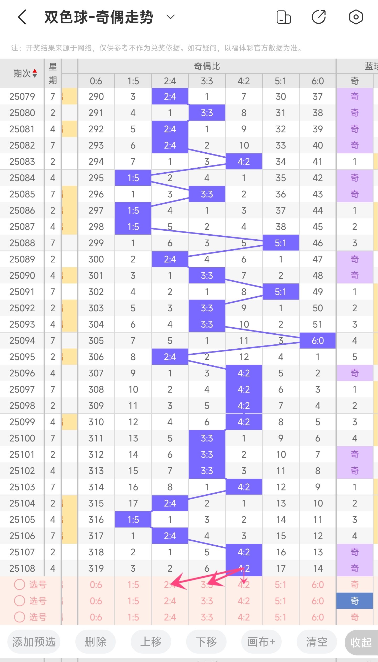 上期奇偶比为4:2,分别为奇奇偶奇偶奇。往前一期奇偶比为4:2。通过近30期内奇偶走势的数据分析,目前1:5奇偶比开出的概率是13.33%,5:1奇偶比开出的概率是6.66%,3:3奇偶比开出的概率是26.66%,4:2奇偶比开出的概率是26.66%,2:4奇偶比开出的概率是23.33%,6:0奇偶比开出的概率是3.33%。与前一期相比,4:2奇偶比概率变大了,3:3奇偶比概率变小了。通过分析走势图,上期开了2:4奇偶比,2:4和3:3以及4:2奇偶比是比较常开出的,而3:3奇偶比也好几期没开出了,也有可能会被开出。所以推测大概率可能会开3:3或者2:4奇偶比,小概率继续开4:2奇偶比,更小的概率开1:5或者5:1奇偶比。