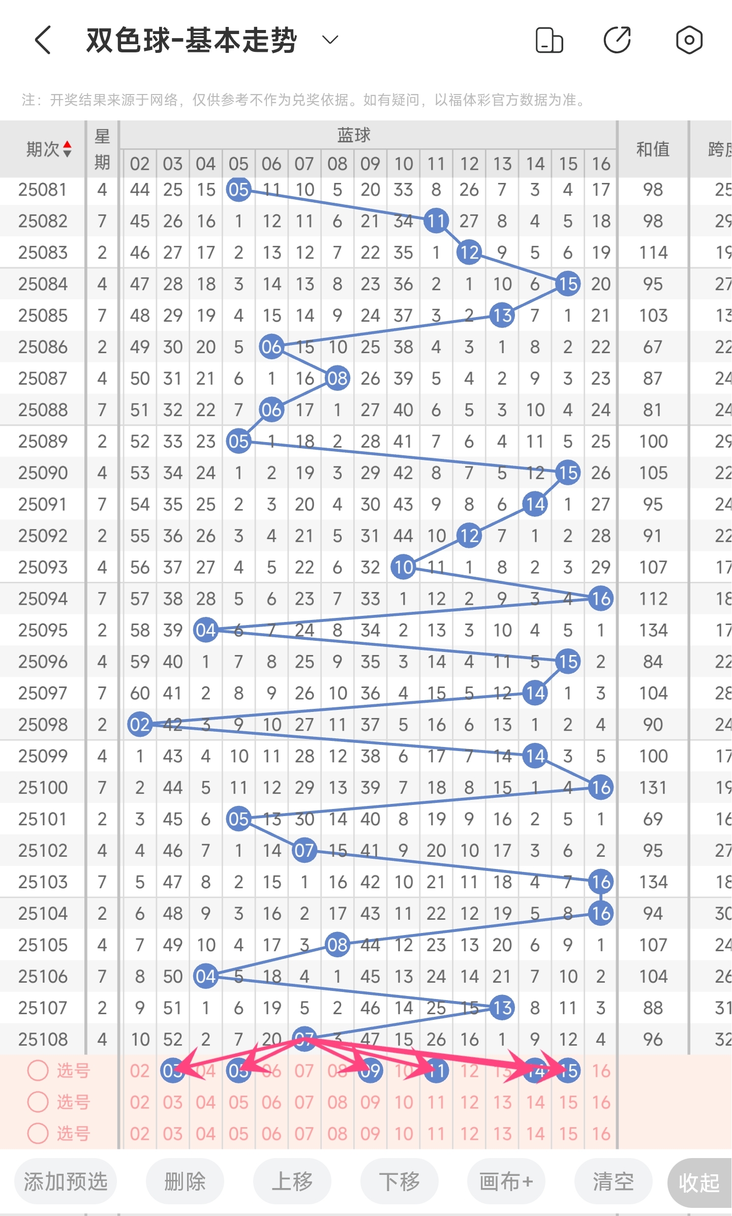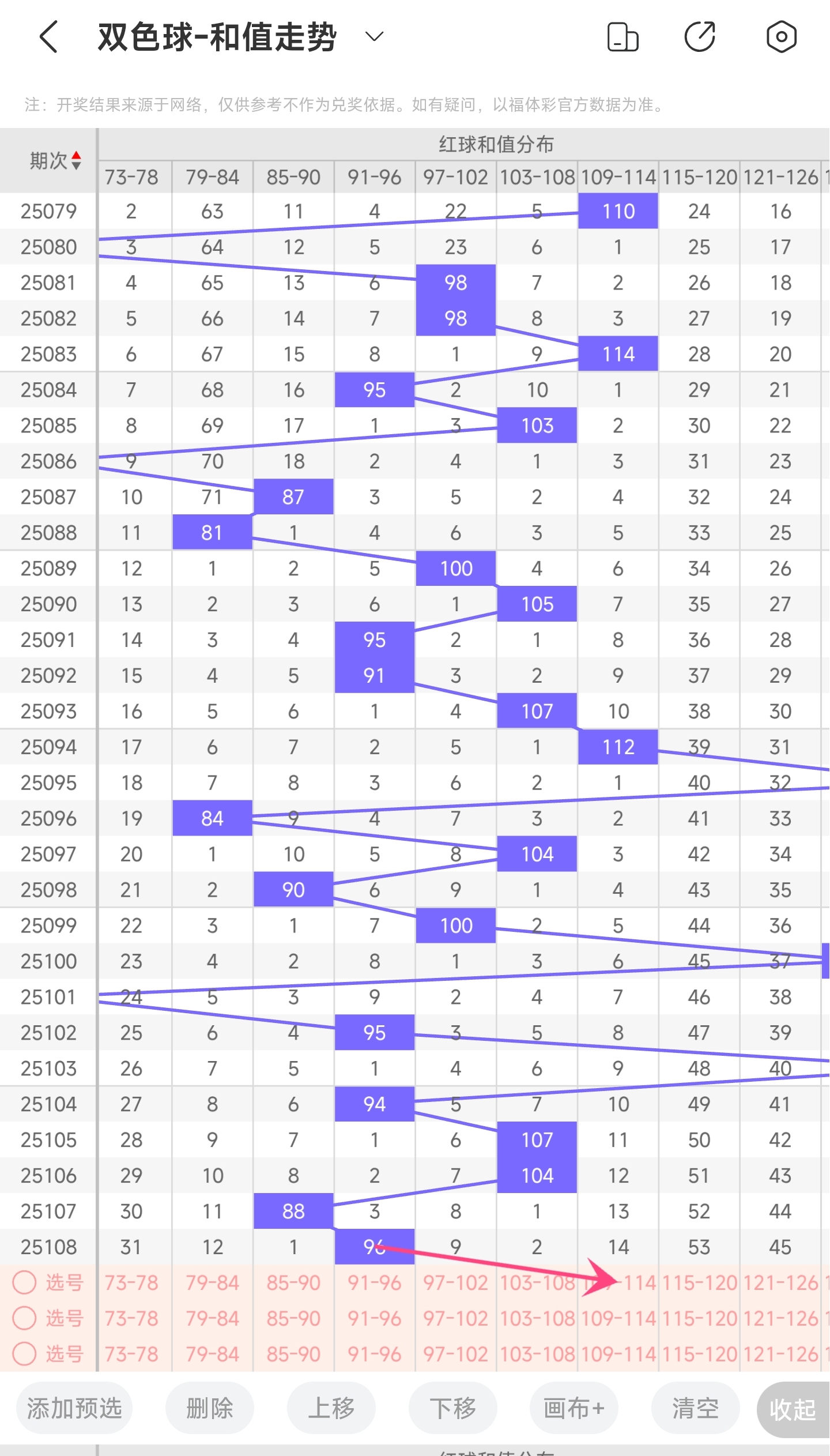 上期和值为96,而近5期和值为134,94,107,104,88,96均值98.4,上期和值较前一期增加8,振幅为8。96和值是属于近30期内开出的比较中间的和值,下降的的空间和上升的空间差不多,本期更看好大和值。所以推测本期比较大概率会继续往右上升,和值变大,小概率往左,和值变小。