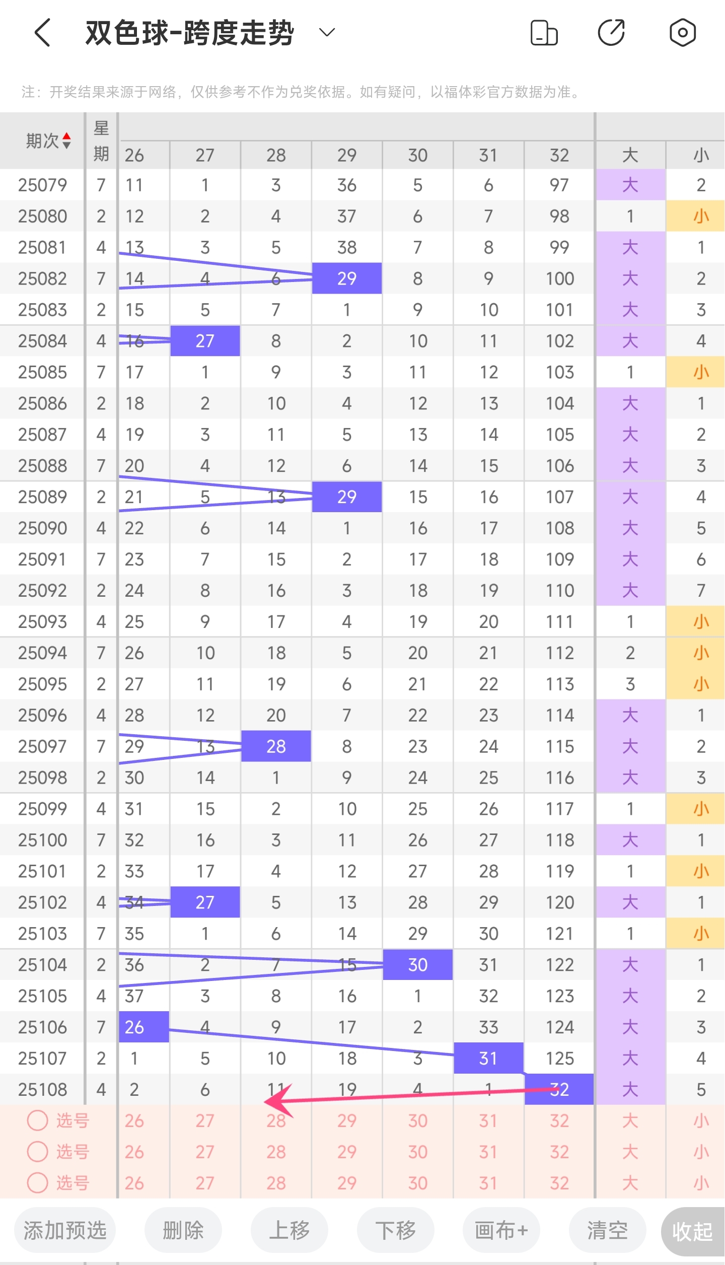 上期龙头为01,凤尾为33,跨度为32,往前一期跨度是31,偏移量为1。32跨度值是30期内开出的最大的跨度值。已经没有继续上升的空间了,下降空间比较大,但有较小的概率会保持不变。所以推测本期跨度有较大可能是跨度变小,趋势往左,极小概率趋势不动,跨度不变。