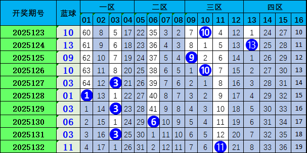 上期蓝球开出奇数号码11。近期奇偶球比值7:3,奇数球走势活跃,本期看好偶数球热出,推荐号码16。