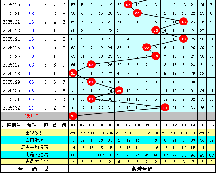 遗漏分析:最近7期红球遗漏总值分别为:7、31、27、29、57、14、20,开出4个遗漏值9以上的冷码红球,目前红球遗漏值9以上的冷码红球有4个:06、11、22、29,本期不看好这几个冷码,预计继续轮空。