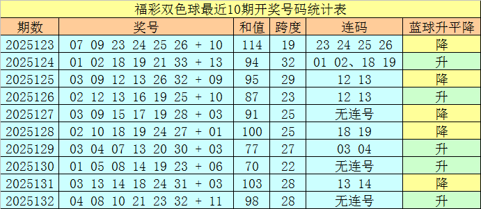 上期开奖:福彩双色球第2025132奖号开出:04 08 10 21 23 32 + 11,红球号码和值为98,首尾间距为28,无连号。