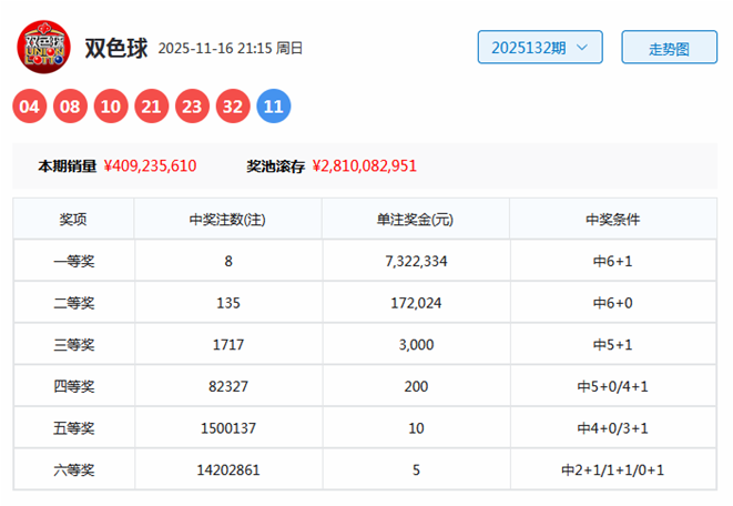 双色球第2025132期开奖,红球:04、08、10、21、23、32;蓝球:11。其中红球012路比为1:2:3,奇偶比为2:4,和值为98,跨度为28,蓝球开出2路号码。
