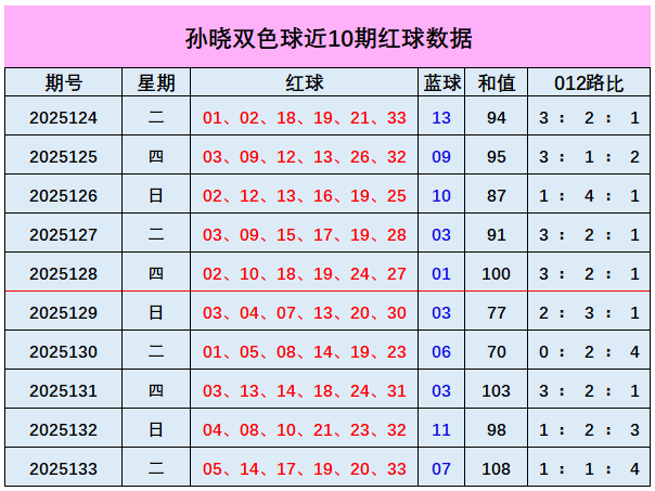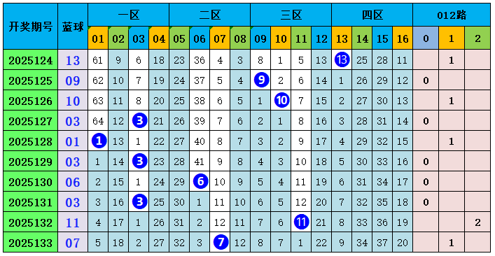 上期回顾:双色球第2025133期开出奖号:红球05、14、17、19、20、33;蓝球07,其中红球和值为108,012路比为1:1:4,奇偶比4:2,蓝球开出小奇数号码07。