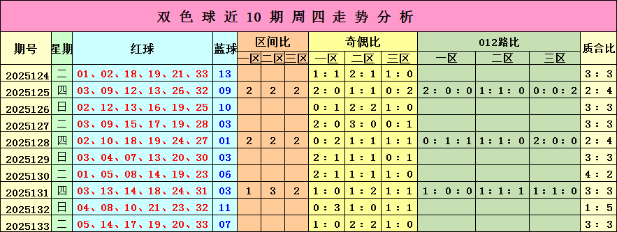 红三区(23-33):上期该区开出1个33,上周四该区开出2个24、31,最近10期该区开出14个奖号,最近10期星期四该区出现6奖号,近10期断区0次,近10期星期四断区0次,本期注意该区落号,排除断档。最近10期该区奇偶比为7:7,其中星期四分别开出奇偶比为0:2、1:1、1:1,偶数号码相对热出。最近10期星期四该区号码012路比为3:1:2,本期该区重点关注3码:23、29、32。